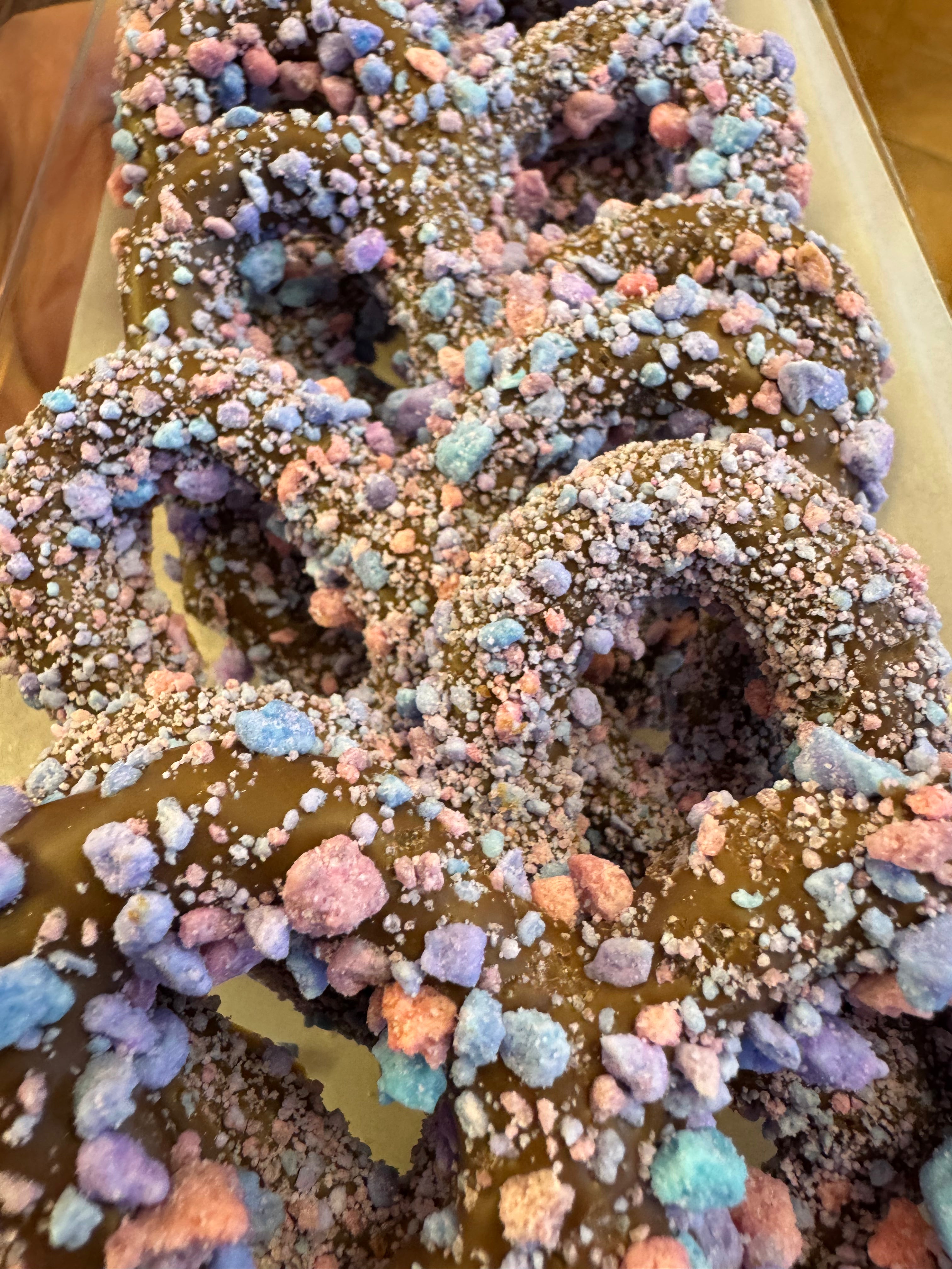 Our large 3 ring pretzel covered with chocolate and decorated with fun and delicious toppings! Fun and delicious!